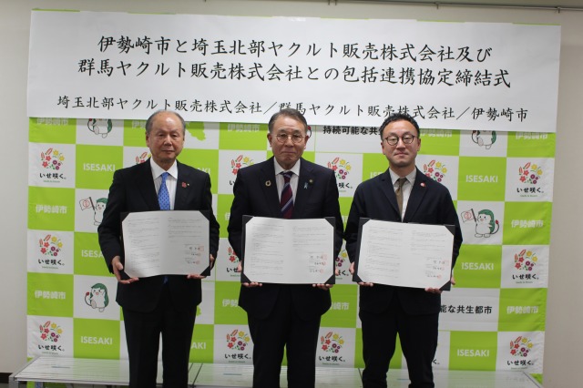 3月10日、伊勢崎市役所にて、群馬ヤクルト販売(株)、埼玉北部ヤクルト販売(株)が伊勢崎市と包括連携協定を締結しました。