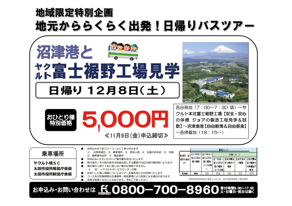 12月8日(土)「沼津港とヤクルト富士裾野工場見学ツアー」を地域限定特別企画で開催いたします!