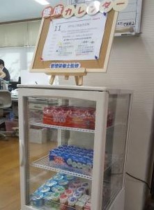 前橋市の板垣労務管理事務所様では、従業員の皆さまがいつでもヤクルト商品を手に取れるようにショーケースを設置させていただいています。会社で福利厚生として購入いただき、職場の健康づくりに役立ていただいています。季節に応じた管理栄養士からの健康カレンダーも一緒に掲示しています。会社が従業員の健康を守る取り組みを応援して参ります。