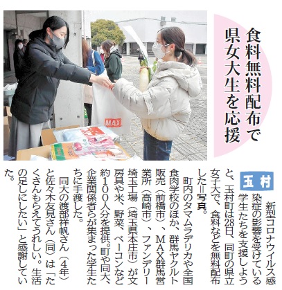 2021年1月29日の上毛新聞で、県立女子大生への商品提供の様子が掲載されました。コロナ禍で影響を受けている学生を支援しようと玉村町とそれに賛同した民間企業が行ったもので、群馬ヤクルトも参加しております。学生の皆さんの励みやつながりのお役にたてれば嬉しいです。