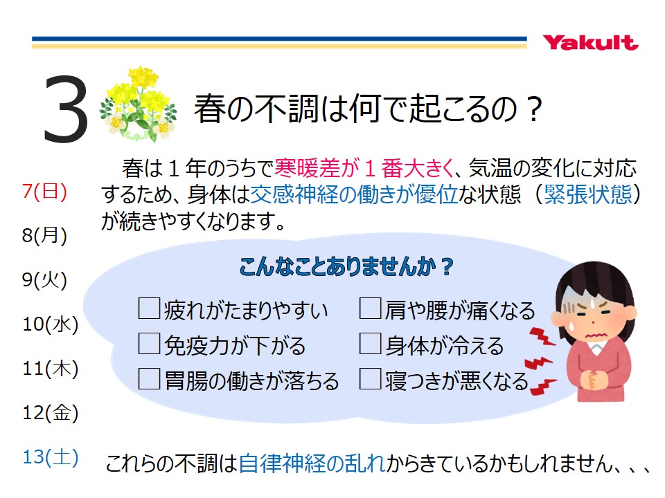 春はすぐそこまで来ています。新しい生活が始まる出会いの季節。しかし、春に起こりやすい体調不良・・。その原因は??