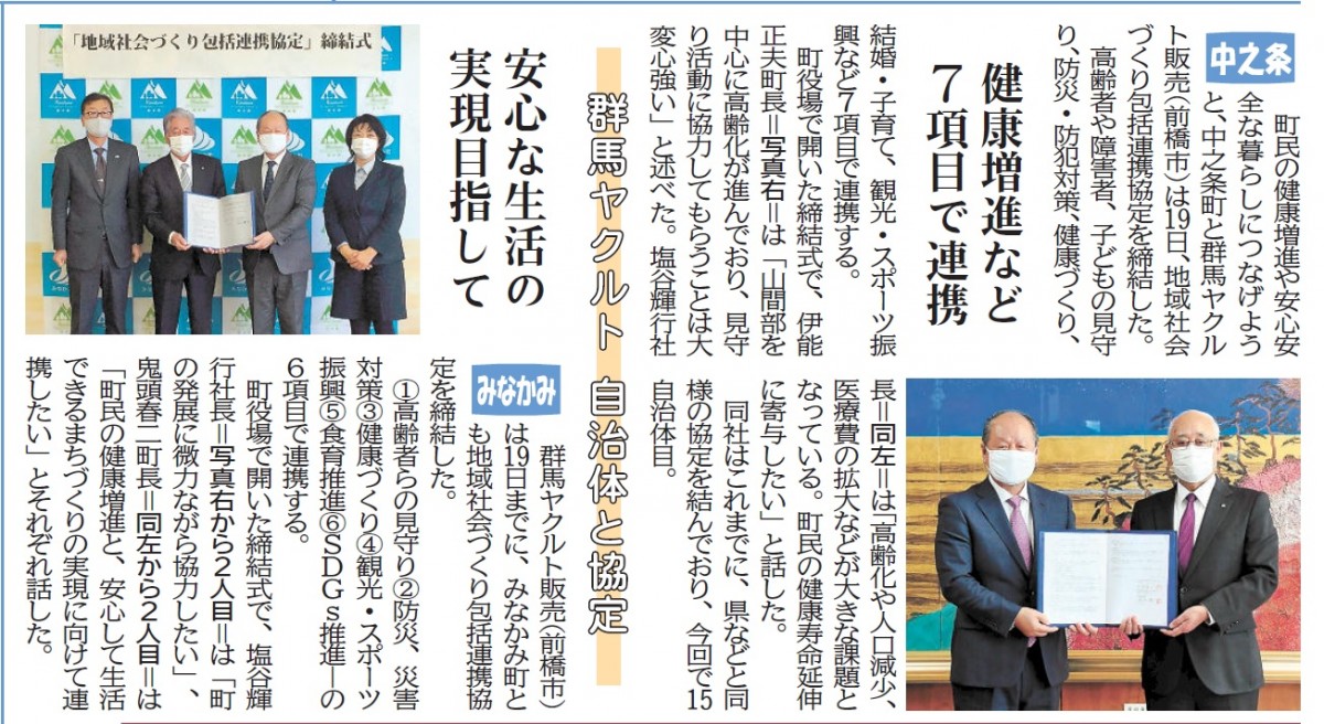 2021年2月20日の上毛新聞で、中之条町、みなかみ町と協定を締結した様子が紹介されました。