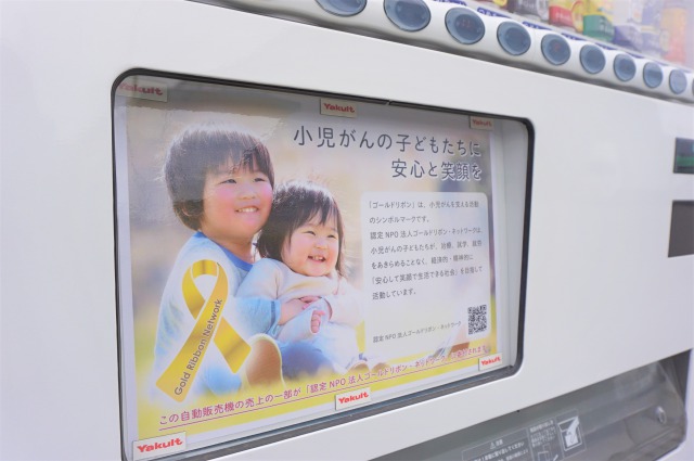 2021年4月前橋市の企業様2社にゴールドリボン支援自販機を設置させていただきました。ゴールドリボンの活動は小児がんの子どもたちを支える取り組みです。この自販機の売り上げの一部は、認定NPO法人ゴールドリボン・ネットワークを通じて支援活動に役立てられます。
