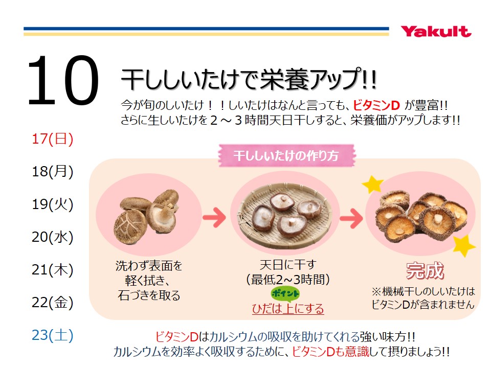 ビタミンDは日光浴により体内でも作ることができますので、しいたけと一緒にご自身も天日干し(日光浴)してみては…?