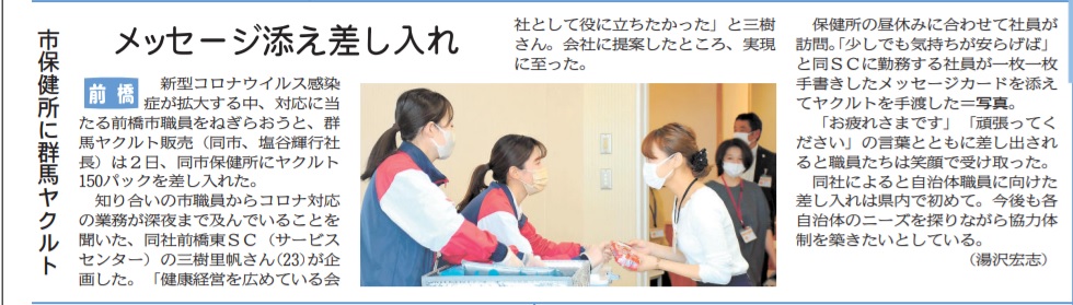 2月3日(水)上毛新聞に前橋保健所へヤクルト1000を差し入れした記事が掲載されました。