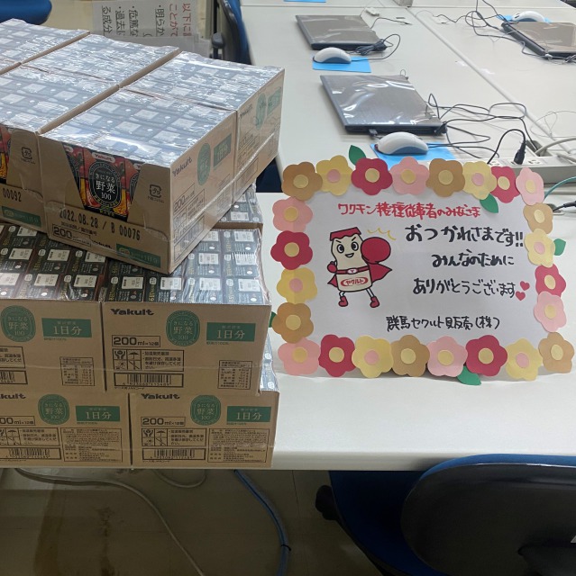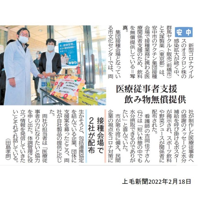 安中市のワクチン集団接種会場で接種業務に携わる医療従事者の皆さまへ商品を提供しました。市との包括連携協定に基づき、接種会場になっている安中市文化センターへ提供しました。