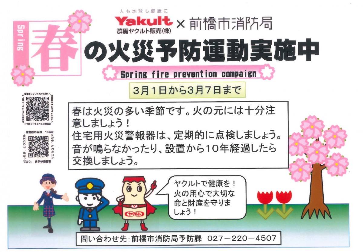 群馬の春は強風と乾燥で特に火災に注意が必要な季節です。群馬ヤクルトは前橋市、高崎市と包括連携協定に基づき、火災予防運動に協力します。