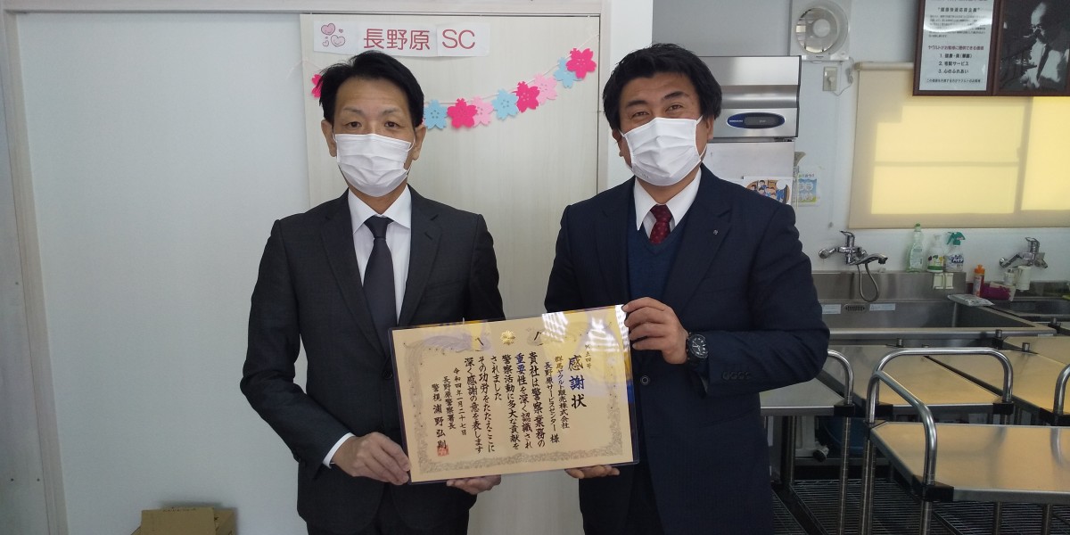 当日は長野原サービスセンターにおいて浦野署長(左)から弊社柿沼社員(右)に感謝状が授与されました。