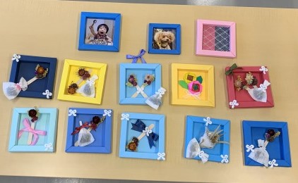 フォトフレームづくりは最初は慣れない作業で大変そうでしたが、それぞれデコレーションして素敵な作品が出来上がりました。