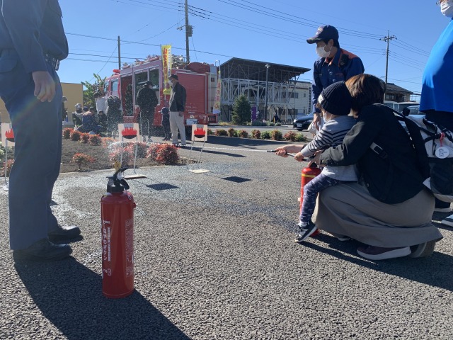 消火器は初めてさわる子が多かったですが、消防隊員の皆さんの分かりやすい解説のおかげでみんな命中してました
