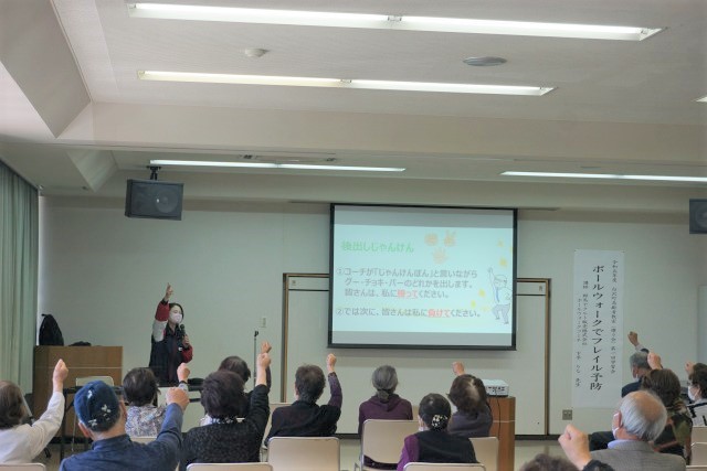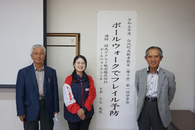 5月24日、沼田市の白沢地区のコミュニティセンターで、老人会の高齢者教室「燦々会(さんさんかい)」の会員の皆さんへ「ポールウォークでフレイル予防」をテーマに講座を行いました。
