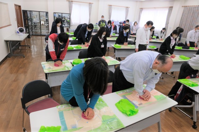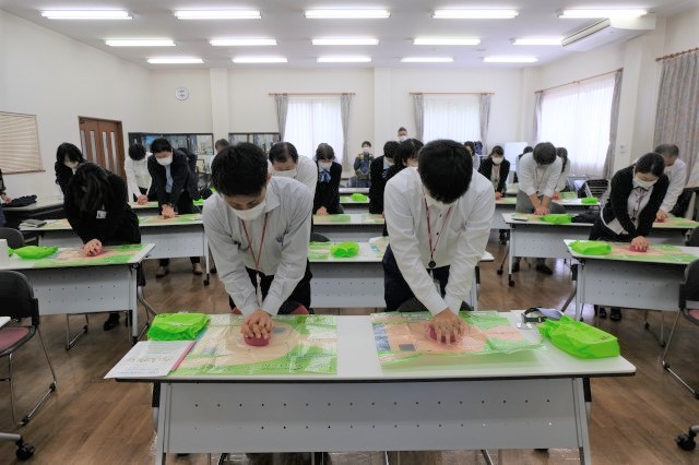 講習では胸骨圧迫を必要とする状況について学び、模型を使用しながら心肺蘇生法やAEDの操作を学びました。