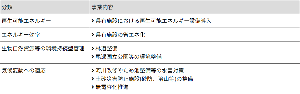 本債券の発行による資金調達は、群馬県が取り組むSDGs⁽2⁾の達成に資する下表の環境施策に充当されます。