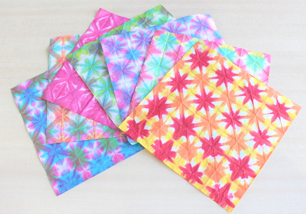 続いて紹介させていただくのは「折染」を教えている田村さんです。折染とは和紙を様々に折り畳んで角を染料に浸していって、それを開くと美しい幾何学模様が現れるという工作です。依頼があれば小学校などに行って子どもたちに教えることも出来るということですよ。ちなみに田村さんは染料入れにヤクルトの空き容器を活用されているとのことです。作品に興味のある方は、ぜひ田村さんのインスタグラムもチェックして見てください。アドレスはmisa_torakichi です。