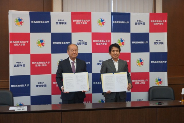 締結式には、群馬医療福祉大学の鈴木利定学長(写真右)と群馬ヤクルト販売の塩谷輝行社長(写真左)が出席しそれぞれ協定書にサインしました。