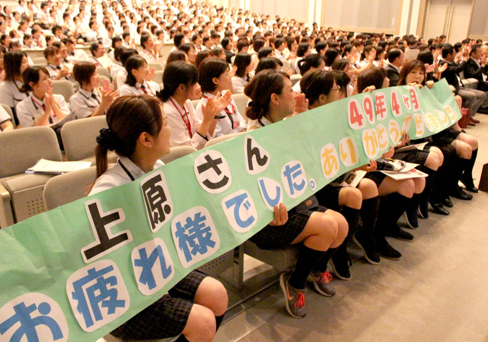 最後は、今年の8月にヤクルト・スタッフを引退された、上原ふさこさんをご紹介します。上原さんはこの時点でなんと83歳。健康と元気をお届けする、ヤクルト・スタッフの礎をつくっていただいた、尊敬する大先輩でしたので、センターのみんなで敬意と感謝をもって送別会(卒業式)を企画したそうです。当日は、全員で金八先生の“贈る言葉”を歌い、涙あり笑いありの感動的な卒業式をしたとのこと。幅広~い年代のスタッフが、同じ目的を持った仲間として活動している、ヤクルトならではの光景ですね。