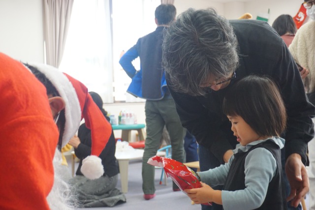 サンタさんが一人ひとりにプレゼントを渡すと積極的に笑顔でもらう子ども、怖くて目をそらしながらもらう子ども…みんなで素敵な時間を過ごすことができました。