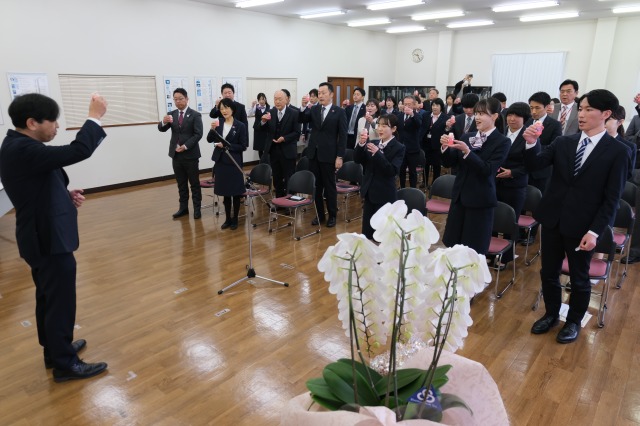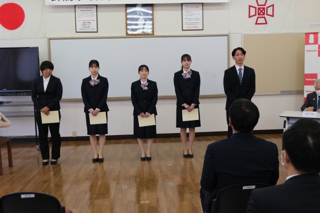 新入社員5名からは、「一日でも早く、会社の一員として地域の方の力になれるようにがんばりたい」「会社の価値観のひとつである、利他の心を実践していきたい」など力強い挨拶をいただきました。