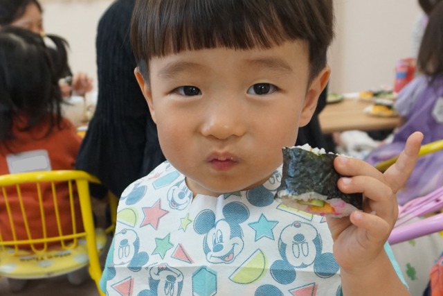 キュウリやたまご、かんぴょうやでんぷ等、たくさんの具材がはいった太巻きをみんな大きくお口を開けて「おいしいね!」と食べていました!お母さんも「こんなに食べるなんてびっくり!!」と喜んでいました!