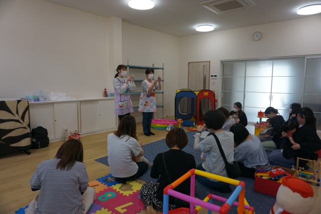 また、保育士の先生方からの「アンパンマン」の手遊びには、みんな上手におててを動かしていました。また大きな絵本の読み聞かせでは目を輝かせて真剣に聴いている表情はとても印象的でした!