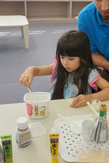 今回は、「豆乳の力」を使ったアレンジレシピを参加者のみんなで作りました。いちごジャム、ブルーベリージャム、きなこ、粉砂糖、しょうゆ、わさび、しょうがなど様々な味わいのトッピングを楽しみました。