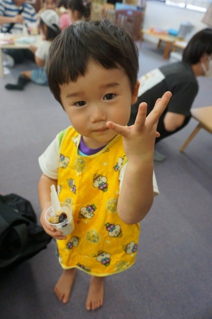 外遊びではヤクルト釣り堀を実施しました。ヤクルト容器で作ったお魚の点数の合計点でお菓子をプレゼントしました。